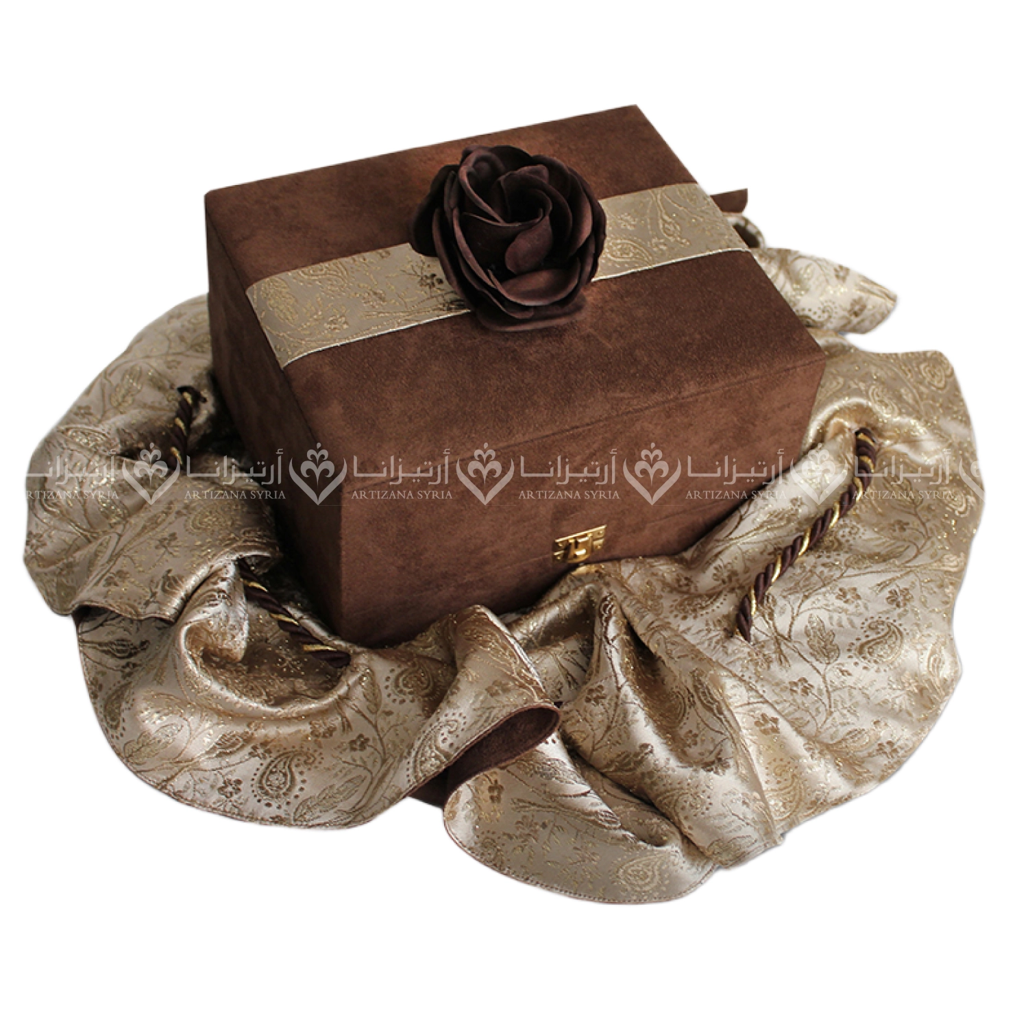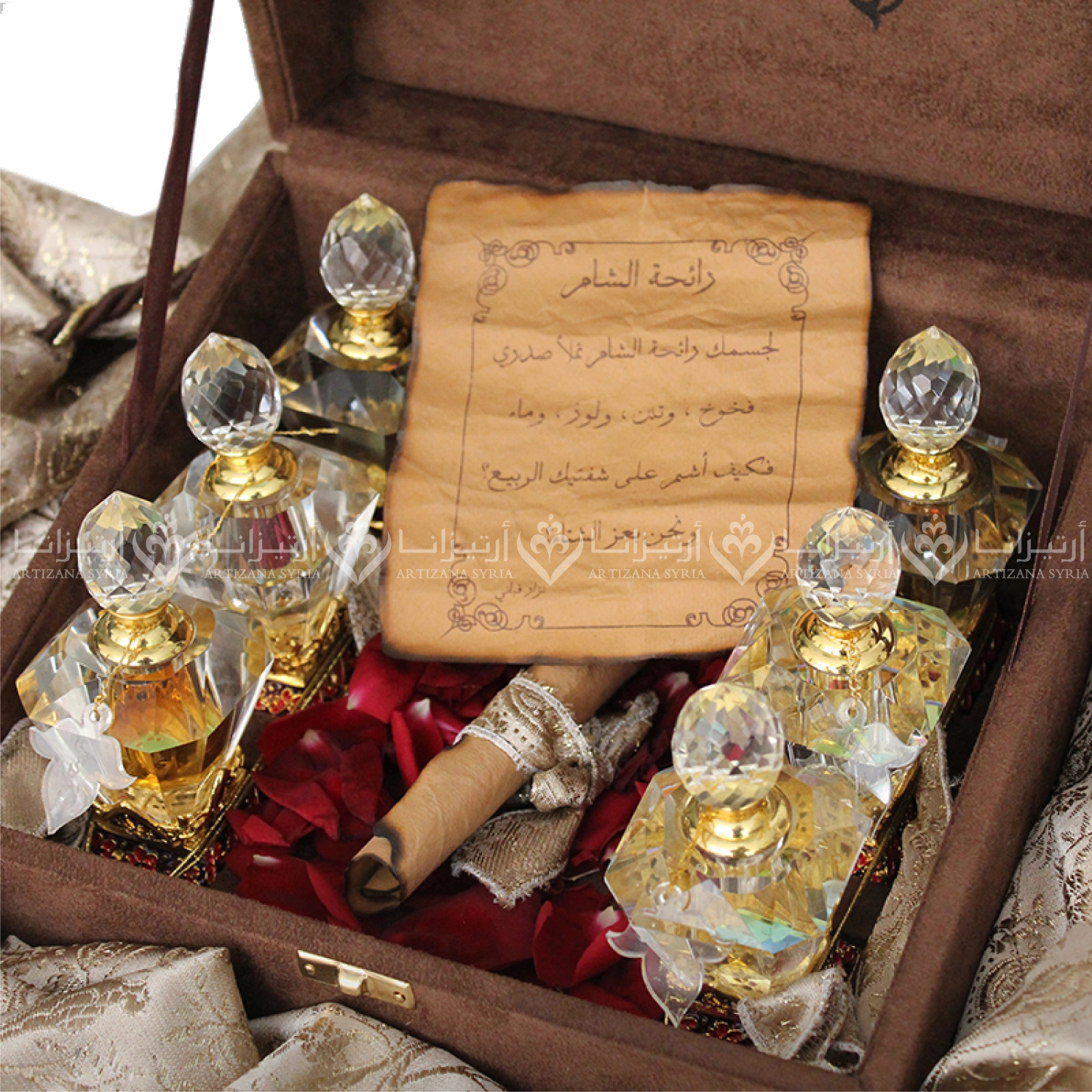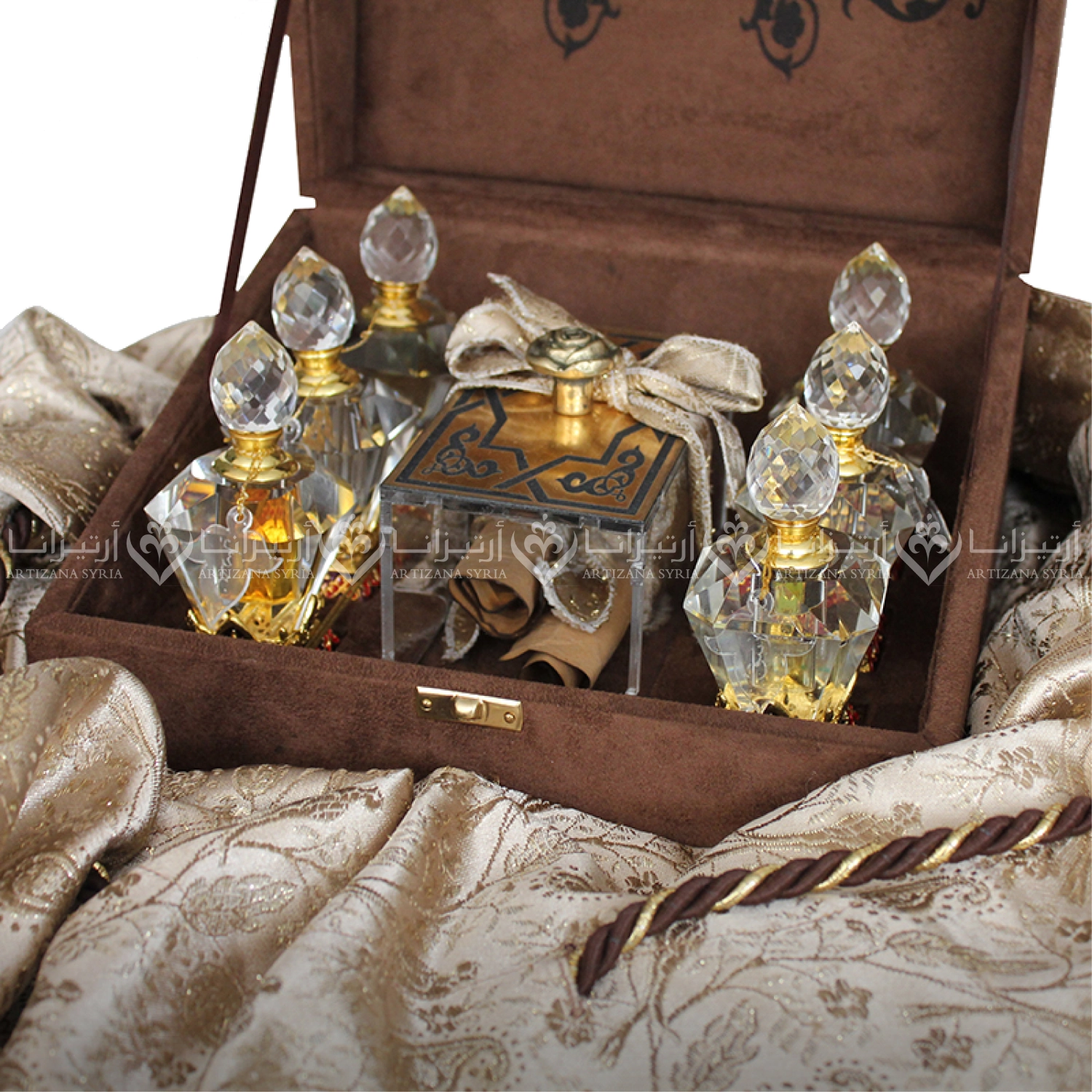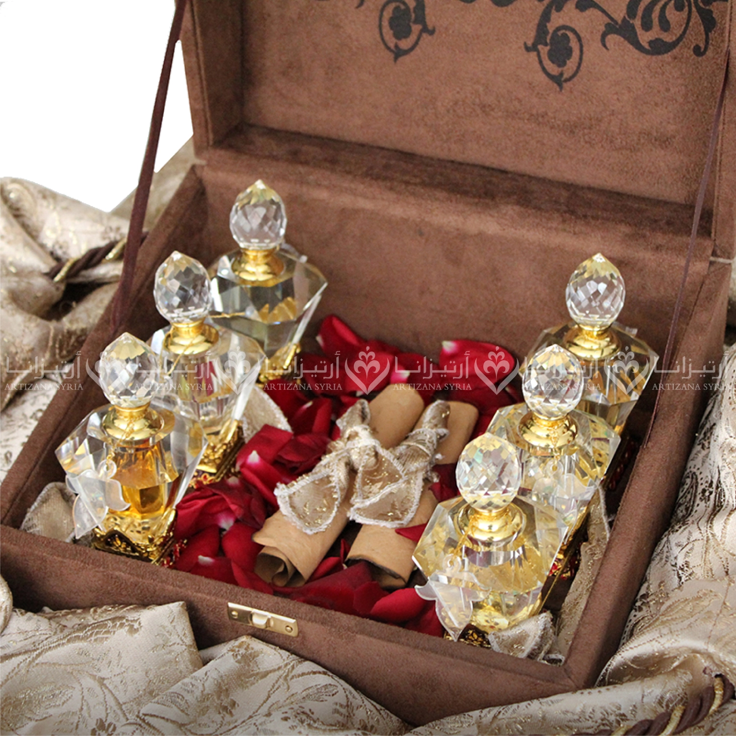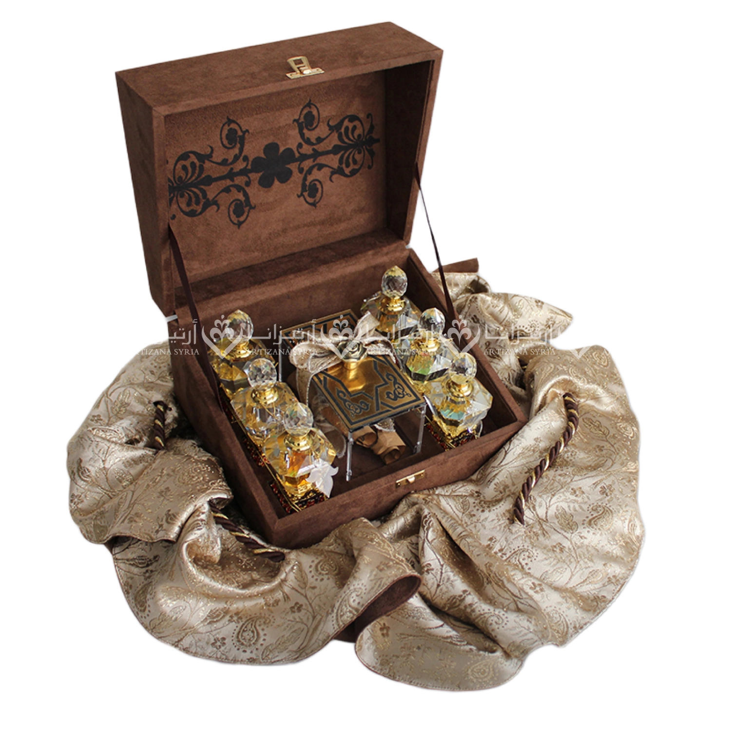 Velvet box with a natural brocade pouch containing Damascene perfume bottles