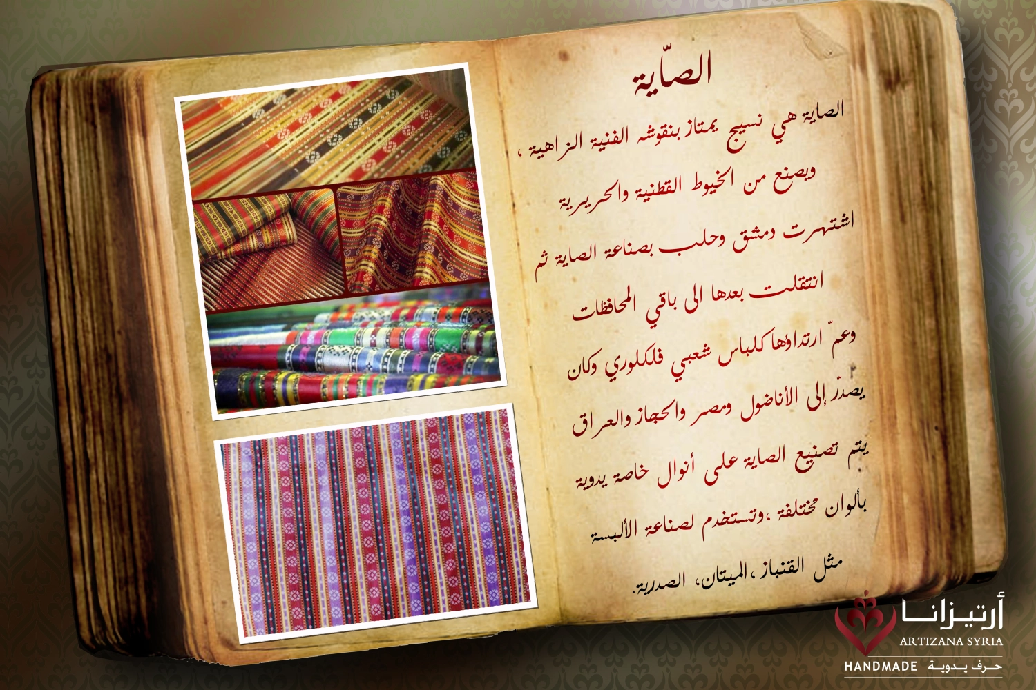 The sāyah is a fabric characterized by its bright artistic patterns. It is made from cotton and silk threads. Damascus and Aleppo were famous for manufacturing sayah, which then spread to other provinces and was worn as folk clothing. It was exported to Anatolia, Egypt, the Hejaz, and Iraq. Sayah is manufactured on special hand looms in different colors and is used to make clothing such as qanbaz, mitan, and vests.