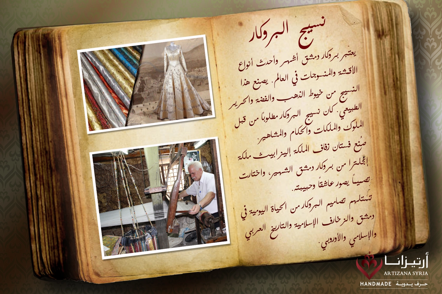The designs on brocade are inspired by everyday life in Damascus, Islamic motifs, and Arab, Islamic, and European history.