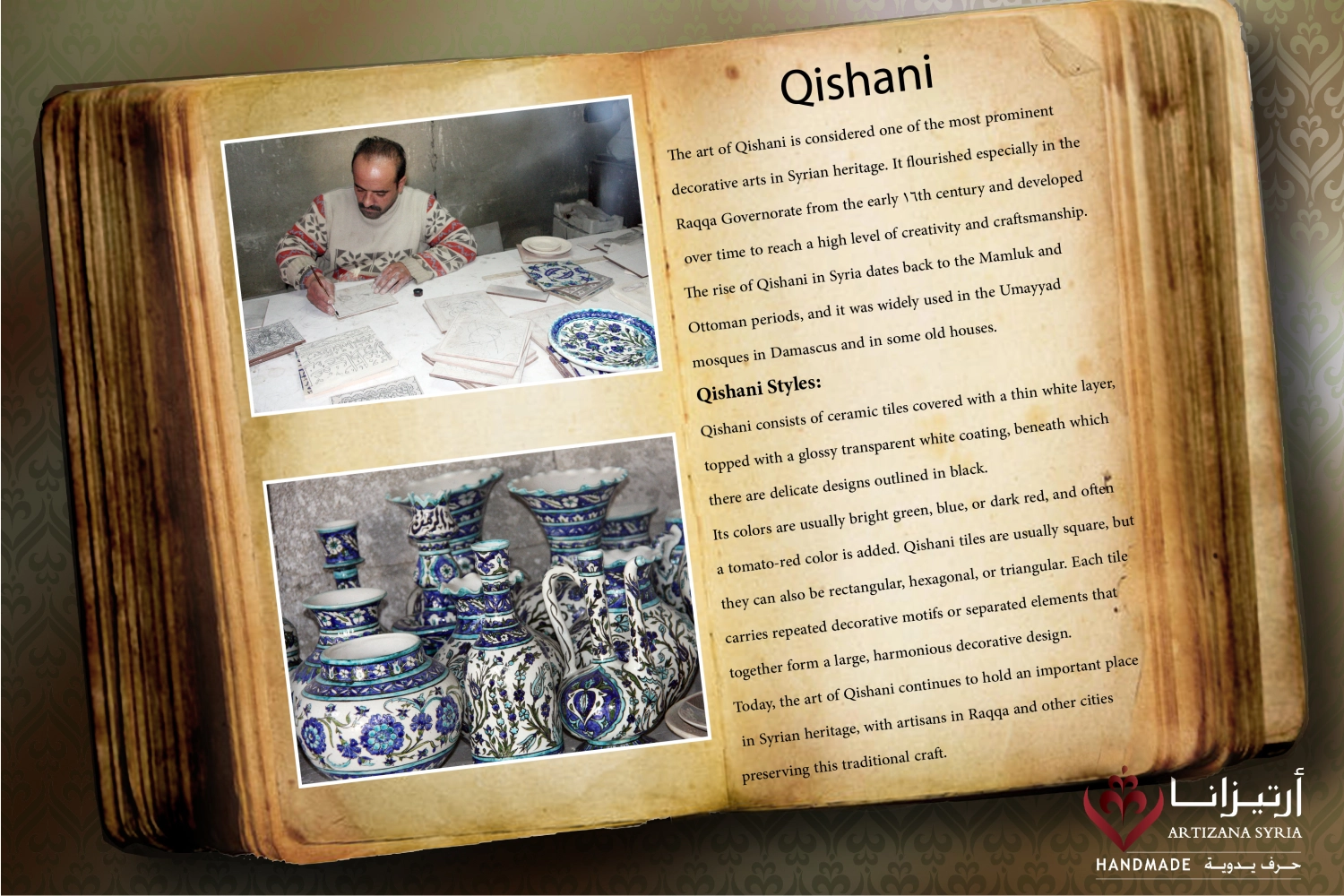 The art of Qishani is considered one of the most prominent decorative arts in Syrian heritage. It flourished especially in the Raqqa Governorate from the early 16th century and developed over time to reach a high level of creativity and craftsmanship.