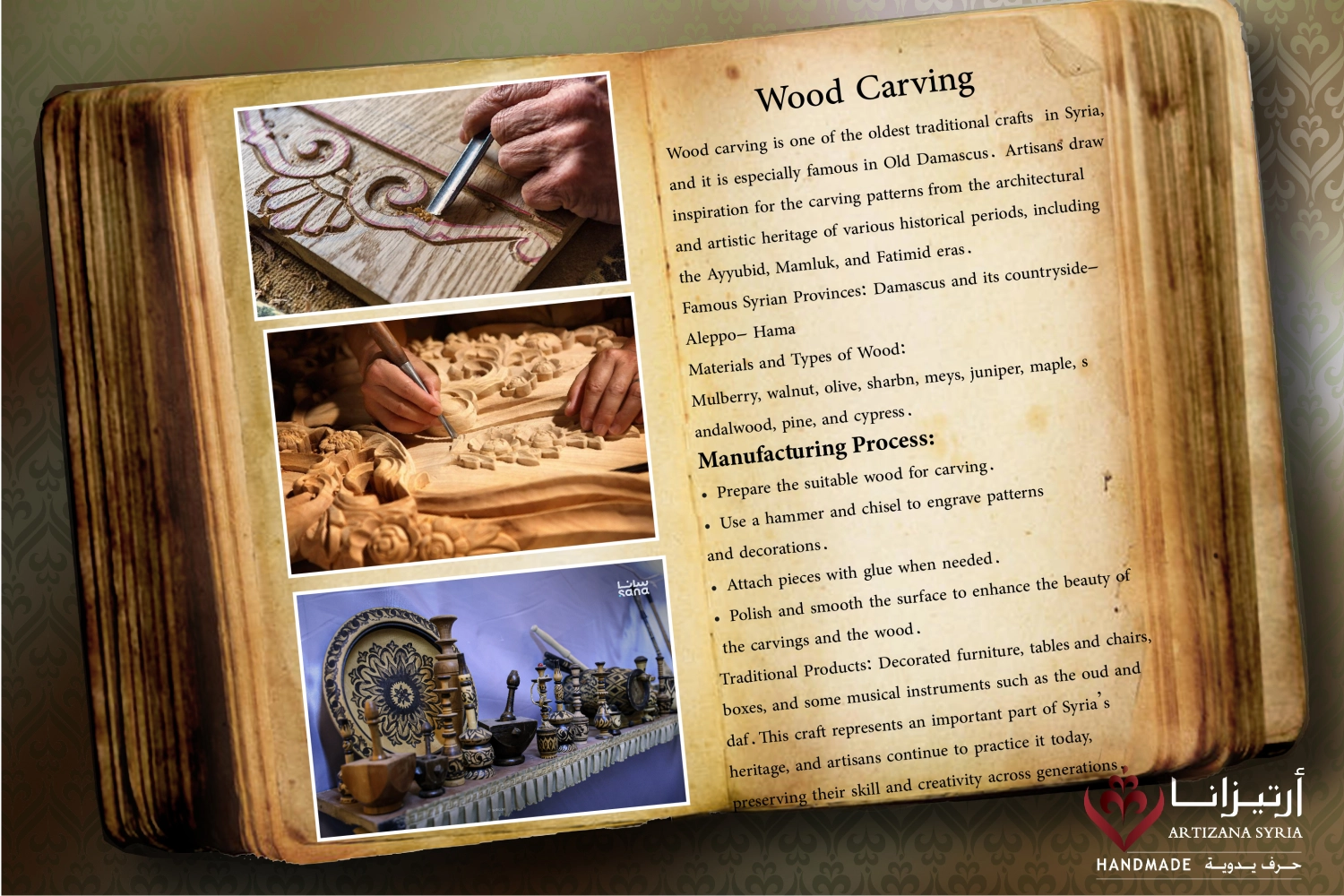 Wood carving is one of the oldest traditional crafts in Syria, and it is especially famous in Old Damascus. Artisans draw inspiration for the carving patterns from the architectural and artistic heritage of various historical periods, including the Ayyubid, Mamluk, and Fatimid eras.