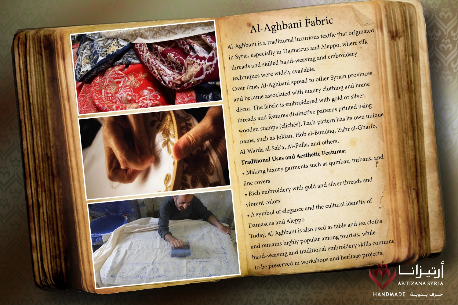Al-Aghbani is a traditional luxurious textile that originated in Syria, especially in Damascus and Aleppo, where silk threads and skilled hand-weaving and embroidery techniques were widely available.