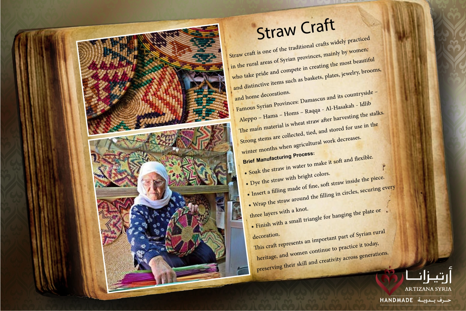 Straw craft is one of the traditional crafts widely practiced in the rural areas of Syrian provinces, mainly by women, who take pride and compete in creating the most beautiful and distinctive items such as baskets, plates, jewelry, brooms, and home decorations.