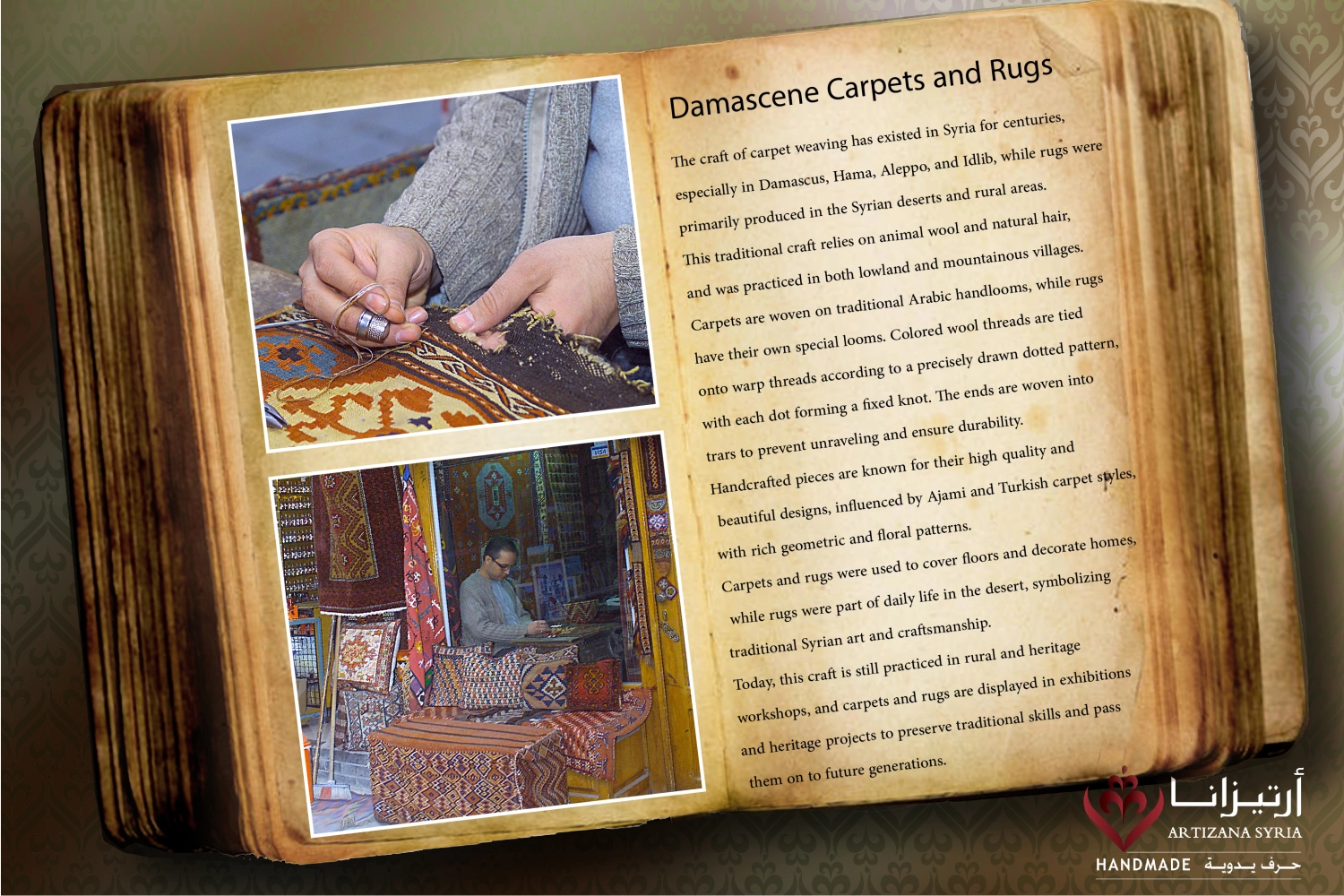 The craft of carpet weaving has existed in Syria for centuries, especially in Damascus, Hama, Aleppo, and Idlib, while rugs were primarily produced in the Syrian deserts and rural areas. This traditional craft relies on animal wool and natural hair, and was practiced in both lowland and mountainous villages.